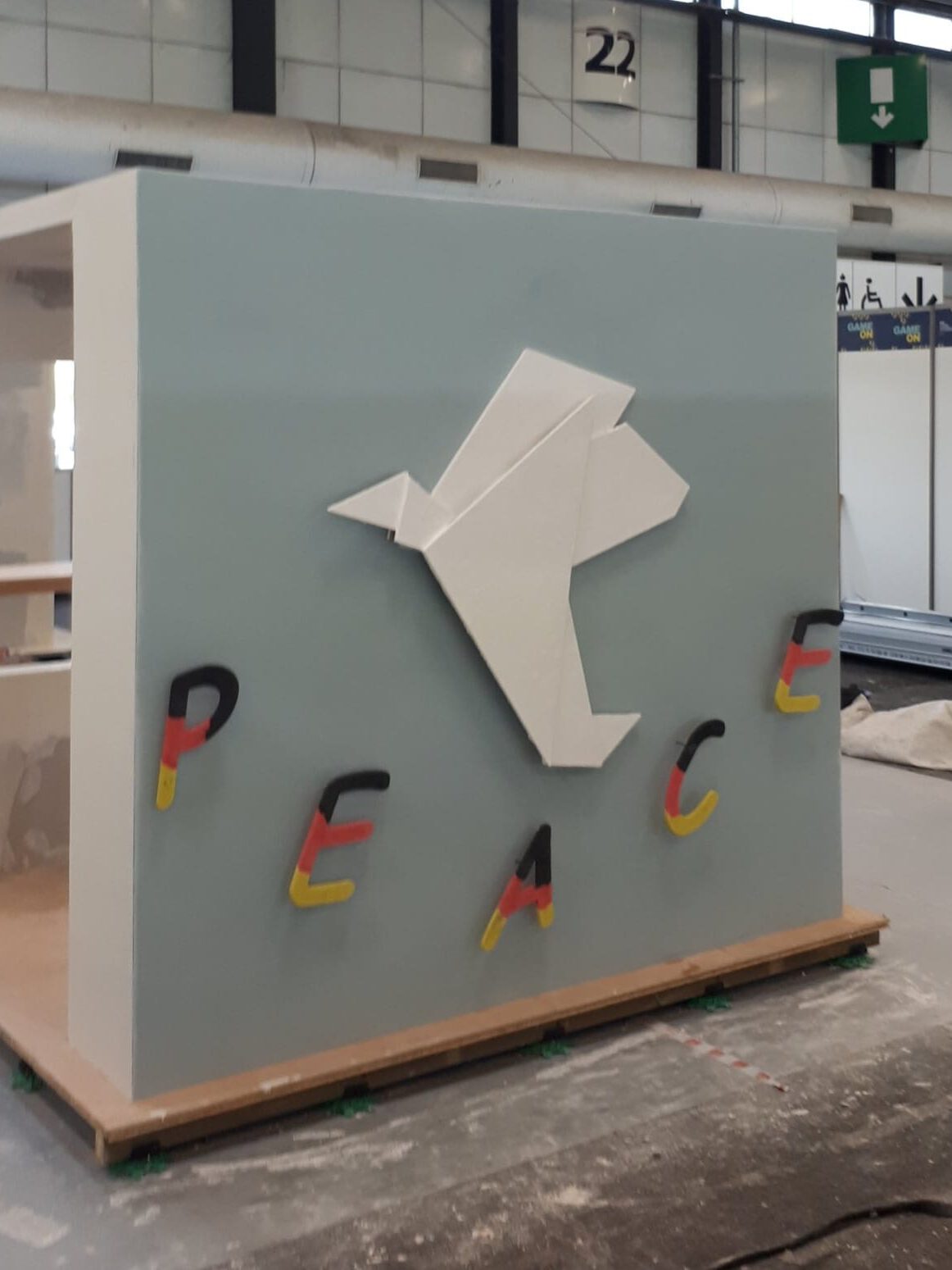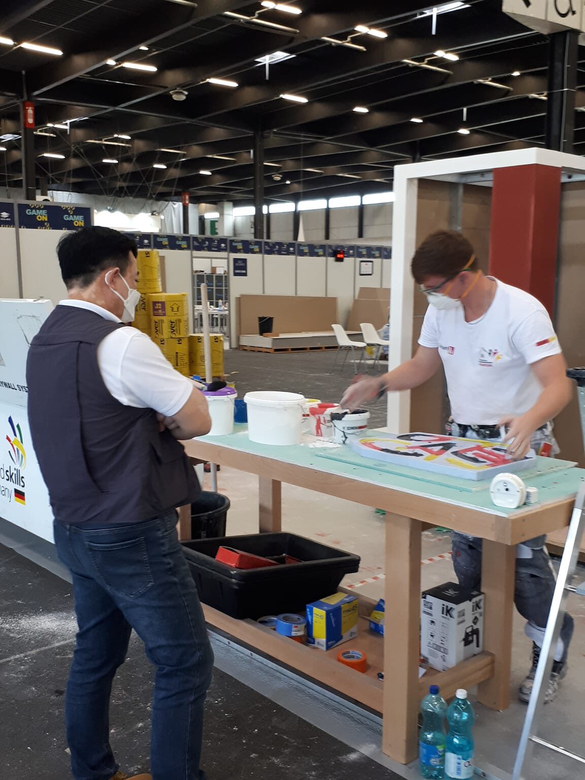 Beim Stuckateur-Wettbewerb stand eine anspruchsvolle Trockenbaukonstruktion mit Öffnungen an. Im Speedmodul setzte Marc Stuckprofile und sendet mit Freestyle „Peace“ eine weltweite Botschaft.